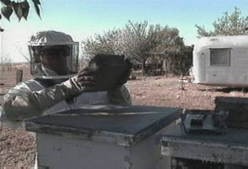 Fast forward through time to the moment after he has actually closed the hive. We don't see him, but he's still there... crouched behind the hive for just a moment, getting the crude concrete rock that keeps the lid definitely on those bees. When he is done, Jacob walks back towards the house. The bees are trapped. Jacob will be free.