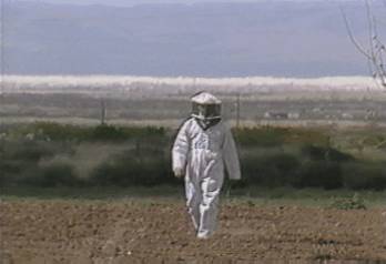 The medium of these collapsing cartoon stars, whatever they are, takes us non-coincidentally by dissolve to Jacob Maker, who owns an eye in this story. Jacob is walking across a red dirt field near his desert home in Alamogordo. They say red dirt is emblem of a place once humid with palm trees and animals. Jacob is the hero of the film. Beyond him is a white strip of White Sand, his penultimate destination in the story of his story.