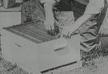 The clouds of smoke have dazed the bees, a cloud of unknowing introduced into the smell-space of the city-hive. Now the ape owner of this hollow wood cube can safely use bare hands to open the bee-home (which the bees did not build, and do not own). Finger morphologically similar to the bones inside whale fins are used with careful articulation to pull out one of the mail-order comb-holding frames from the hive. A metal tool provides some assistance in this operation.