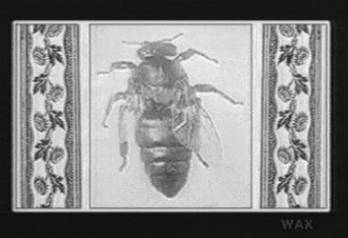 Floating up the Euphrates, between banks of nettled flowers, the Royal Queen heads towards her summer hives, a solemn voyage. The frame in which this picture appears was probably at one time used by a portrait of Victoria, Queen of Steam, who looked well and enjoyed well being glued between the ornamental English flower strips. Some bee fancier cut her out, and replaced the Brittanic head with the full body photograph of an exemplary representative of the bee race (insect species are often dubbed races by their romanticizers).
