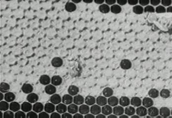 Through a frontal shot of a comb, at right angle to the previous shot in absolute space, but far away at another hive in real space, we see a bee continue in its motion of being born from a sealed cell. The front of the comb resembles photomicrographic images of the bee's eye, so it is as if we were watching through mysterious analogy the action of the bee's sight.