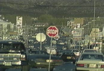 Down one of grid-angled streets. We can see a stop sign. Cars move towards and away from us, and also cross frame. A town with too many stories; walls that block off interiors that communicate by doors and windows, and provide resting places for mobile dreams that often need automotive transport. A big place.