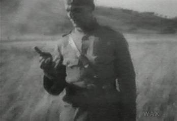 A officer, curious about his tools, examines a gas grenade. There is a battlefield behind him. He has just found the orphan and abandoned grenade while walking along the field edge, thinking about the crops, and seeds that will have to be buried so that the harvest can grow. This is the way officers think, in riddles and parables derived from their education, but always put to practical purpose. Not educated in quite the same way, we might find conversation with such a man (or at least a literal transcription of his momentary, verbal thoughts) somewhat mysterious, like a poem from a burned anti-bible. What, for instance, is the seed? The grenade? Or something or someone else, buried blank, or against its will? Since we are relatively immortal, compared to the amount of time we'll pay to this picture, an entire relative age will pass while we ponder these meanings, and meanwhile the officer will have moved on to other, equally confusing thoughts and duties (which we'll never know about). Now, though only a second has passed for us, it is already tomorrow for him, and the grass behind him has already all been mowed down by assiduous farmer soldiers in the units under his command (and that was his command... Mow The Field, Troops!). The mowing of the hay has flattened the hills and removed the bump of the horizon, so that now we can see far away, to the sight of a near large city visible as a jagged bump beyond the now-linear horizon. The officer's war will have moved on, in that direction.