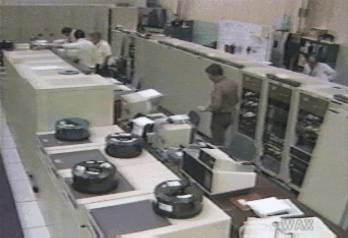 A technician walking diagonally between computers and monitors. He pauses to consider some scene on a small