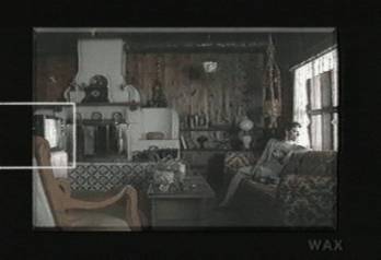 As Melissa turns away, a white box appears around the tv, with it's left edge extending into darkness, and then beyond to nothingness, or a different space. Melissa sits down, all the while looking out the window, until she gives up and reaches for her work notebook. Music notes come from another room, where the radio is between channels; one of the words from the accidentally-tuned talk show makes its way through the overlay of alien notes, then down the corridor air, into her local air, and somehow through here ear and onto the page she's writing.
