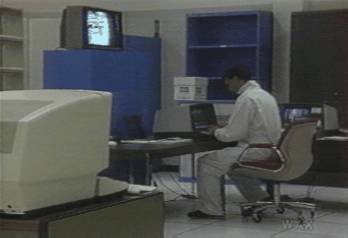 typing at a monitor in what appears to be his