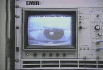 eye looking out of a video monitor in a generic direction, without blinking. A