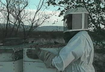 A parallel or succeeding instant where Jacob stands with his hands on both sides of the top of the hive, pausing to listen before completing his hive-disassembly. He hears the world in acute stereo, and, charmed by the space of sound, holds still, feeling the opera of day suddenly in and around him.