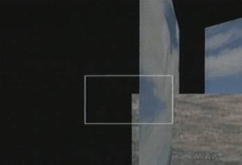 Where there should be a sky, we instead see a white box, another species of target acquisition device, which floats over broken, coherently choreographed planes of sky, all in black. Parts of Alamogordo and the desert beyond appear on these landscape fragments, which shuffle each other like insubstantial playing cards.