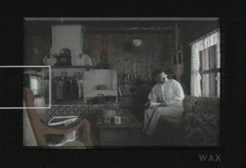 Jacob turning on the tv at home. A white box over the tv, where the yoke would be... the raw center of the electron gun. The edges of the frame, and the darkness beyond it, show coarse living pixels only seem to be alive and real when we are close to them. The white box now surrounds the tv. Jacob falls back onto the sofa with a newspaper in his hand. On the newspaper... news of the day, in Esperanto.