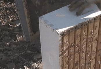 Jacob picks the broken hive off the ground. Modular, made for orientation and assembly in any sort of gravity, the beehive section (if we may speak of it as a feeling, sentient body) doesn't mind sitting sideways on the ground. though certainly those bees with property right at the box edge, and who usually shop across the crack at cells in the other box, might prefer to have the gap sealed.