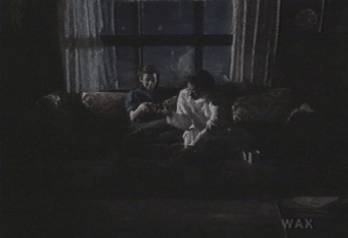 Melissa and Jacob happy in flickering light on the couch. He is drinking coffee. They share dried astronaut ice-cream, spumoni flavor. Survival in outer space has been well thought out... this ice-cream has been tested in live trial, actual dangerous moments, without any astronauts suffering cognitive dislocation (other thoughts, like - why dried ice cream - why am I here - who am I - freeze dried why who what when?).