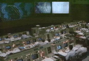 Many people at the consoles at the mission control center for the shuttle. The world is in front of them on tv. Or, at least, the back of Ronald Reagan's head. N.B. Lady MacBeth was only Mr. MacBeth's stage wife. In real life he had a cousin named Ronald, and a wife named Matilda. In latter years, when Mr. MacBeth was wont to spend too many hours watching his cousin Ronald, the newly minted President of the United States (whose likeness could be see on the nickel, dime, quarter and half dollar, with only the penny and dollar reserved for future heroes) on the tv, Matilda would often come into the room and exclaim ...What is this that I see before me!..., giggling, quoting from the play that made her husband famous, and paid for this house and tv.