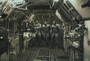 Astronauts at home in their Airstream above the atmosphere, appearing to be somewhat embarrassed. For who among the audience may have Xray eyes. or how do the strange rays traveling through empty space all around them effect their television image? Are they frowning? Can anyone see the nervous tics?