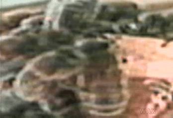 Multitude of bees on a comb. Their bodies are made out of living pixels. Their lives electrically regenerated moment by moment, by carefully tuned clocks that all operate together (...left to right...-clocks, ...top to bottom...-clocks, ...here to there...-clocks, ...what time was it this time yesterday...-clocks). All these oscillations grow, combine, and together meet all at once to make tiny picture pieces, all working in organization to make the bodies of these coherent (but soon to vanish) working bees.