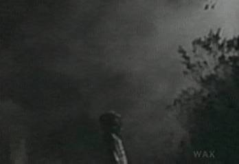 at bottom of frame, silted by the roiling mist, as the flying (frying?) machines descend to mash him.