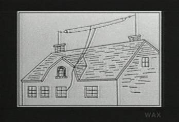 Suspended on a rooftop we see either a transmitter or a receiver for such a back of the head mirror, which has the potential of turning something previously difficult, such as the transmission of the dead, into something available to each and every household, and indeed for every person... creating a need as common and necessary as grooming.