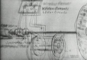 Diagram of a motor-driven mechanical television of the 1920's. It is the Nipkow disk, that wheel with the circular spiral cut though it, which is used by this machine to dissect images for transmission. Note how in total it accidentally looks like the axle and wheels of a railroad car. Nipkow worked for the Berlin railroad company in the 1880's, helping design a semaphore signal system for navigation through the growing urban track maze. Ella is aware of this and other coincidences.