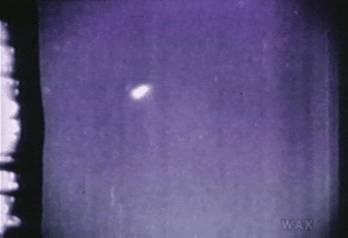 Rising through the microzones of air, each of which has its own sort of dust. trespassing on the 100 year old aerial home of the Krakatoa dust family... blowing destructively through (an accident) the aerial Museum of Air Expunged from Leaders, which includes the last breath of George Washington (survived the missile passage) and the first breath of the last French Emperor of Mexico (also survived, a certain miracle!)... meanwhile, a school of UFO's sighted over the port wing, and the missile takes on this shape. All of these interesting facts, collected under the title Voyage of The Missile From Here To There, can be read in magazine form, stamped and made machine-readable on the side of this frame (running top to bottom on the right, like Japanese subtitles).
