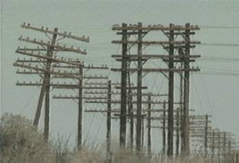 A look down along the telephone and power poles, some at crazy angles. Surface structures often fall down here. This land is hollowed by impact sinkholes, and the tunnels that the buried fragments dig, trying to find their way back to the surface. The fragments are usually so dazed by impact, which has separated them from navigation systems, that they can't tell up from down, and so dig in any which direction. Lots of them, after a while, get used to being underground, and taking difficult for virtue, decided to stay there, rather than head up towards the surface (they've met others like themselves, who told them where up was, but of course they're not going to be heading in that direction anymore).