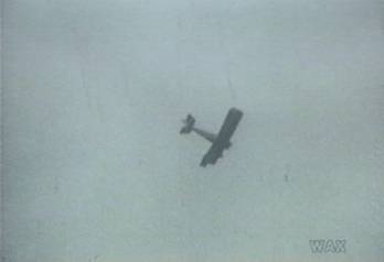 A biplane dives towards the