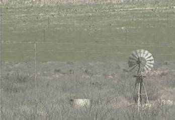 At a distance, the windmill that pierced the side of Jacob's head (allowing insertion of the BeeTV) rotates lonely, extracting water from a well. Here Art (or Bad Science, as it is known among Scientists Who Know) has degenerated, and become Technology, doing useful everyday work here in the desert, dragging up water out of the ground. But you can still feel the glimmer of Uselessness in it, which attracts your eye, your heart, your idle soul in search of either Ethical Encouragement or, more simply, a few moments of relaxation from the daily killing.