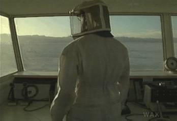 Inside the booth... this room is Much Bigger than the outdoors he sees through the window. Night is day outside... day is night inside... and the horizon, made of some sort of dense metal like tungsten or platinum, chemically reacts with both, creating a bubble-zone at their juncture which is Something Else.