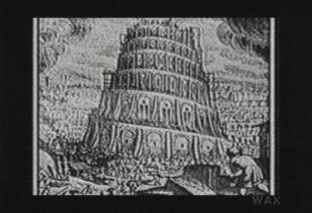 A famous picture of the Tower of Babel's gyre, diminishing into darkness. Once I saw a Japanese movie, projected in a Saturday afternoon gymnasium, which explained the story of an underground submarine that had a screw-shaped nose much like the top of the Tower of Babel... at least that's what you saw for a moment when it popped out of the ground, to confound enemies (who spoke in a foreign language, except when delivering threats, and who lived in the Center of the Earth).