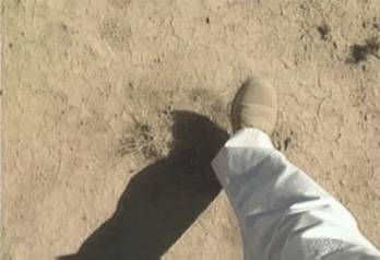 Jacob's point of view, looking down at his feet as the cracked ground moves beneath. Most of the material that fused there during the blast has already been bulldozed up, though not before many enlisted men were able to collect barrels full to sell to rock collectors. Unfortunately, this was a dirty bomb. most of the plutonium vaporized and was captured in the green glass (trinitite) that came to cover the ground in a circle around the vanished tower.