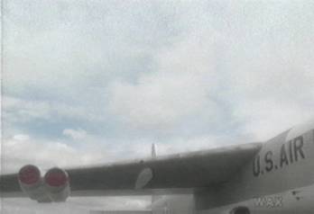 Low angle shot over the wing of this craft. Zoom zoom up up up, a plane filled with passengers, all of them in metal suits, ready to jump without a parachute, heading straight towards the living