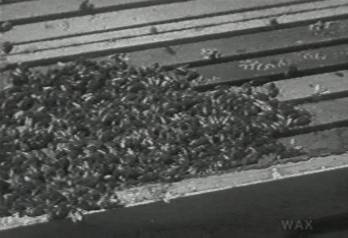 Domesticated bees on the top of a British hive, which is the central axis of the spinning Eden Dynamo. The Eden bees bought this out of a mail-order catalogue; it took their local employees sometime to correctly assemble it, after it arrived, since skeps, not hives, are ordinarily used in this part of the Inner Earth.
