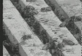 Closer on the diagonal bees. They run in and out of the black and white archive, which stretches an indefinite number of units left to right. Each slatted frame has an indefinite length. Having seen that the cave comb is empty, this is probably that (or that is this). Might simply be a picture from a time when there were many pictures, so many that some could even be stored for later seeing.