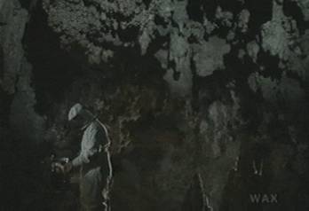 Another of the dark corners of the rounded cave, where metal is ringing in our ears. Jacob appears again from behind rocks, walking towards us. Those are not his shoes making those step noises, but instead one of the composers (Beo Morales) with his hands in shoes, shuffling them across white sand in a box in a studio sometime in the (relative) future. Through a further invisible puppetry of meaning, it turns out that the ringing noise is a call for Jacob there in the cave, on a phone in a small white box recessed right in the cave wall.