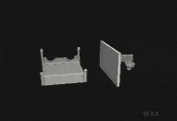 When the sofa-complex of this house for the shapeless and future dead leaves the frame, we follow and discover that they've gone off to the bathroom. Either that, or the elements of that other room have reshaped themselves into this bed/wall/toilet complex. Perhaps the new wall separating the two spaces is a screen on which the bed and toilet watch each other.