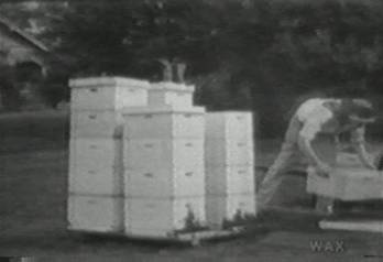 We're in the black and white world now. Some fellow is taking the top off one of a tall group of hives probably filled with honey. The top levels of the hive that hold all that money-making liquor (as is planned in the design of the box) It is a sunny Sunday, church is out, most of the congregation is back at home with their family, except for the beekeeper here, who works day and night, chained to the site (by that leg outstretched behind him), a busy bee in giant form.