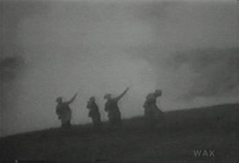 Four synchronized weapon end-users toss their smoke or gas grenades into an already quite large hazy zone. They were once seen by James Hive-Maker, not far from the battle of Ypres. Their arms are quite tired, but they toss day and night, entranced by the toxic haze and hoping that their hazard pay will make for a nice retirement.
