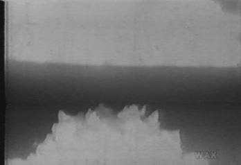 Bad synchronization has placed the top half of Fat Boy's atomic bloom at frame bottom, and the clipped base of the explosion at top of the frame. In between is the ground, the glassy place where the sand is green now, after the hard work of the fiery blast. That ground is what the place between pictures is always like; after the light has done its burning work, the frame becomes fixed and unbreakable. Companies go to work with a toxic stream of rushing, time-based chemicals to make the black into light, but even this wash can't break through the green fused glass that breaks in two the place where the frames meet.