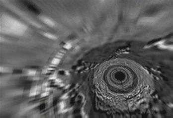 We squint down the compressed tube-mapping of the Planet of Television's black and white interior. A dark void is visible at the far end. A dark eye covers that end of the telescope void, and it watches, looking down our cornea, into the eye fluid, down to the nerve matrix beneath which touches the brain and the past.