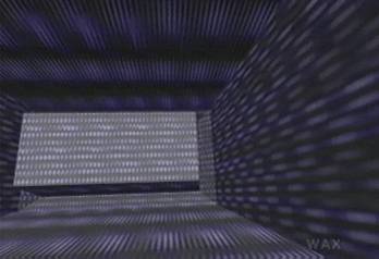 We enter the space that appears to be behind the flat screen of the weapon box, but which may also be a different moment in the continuing folding of this dangerous shape. We head like an anti-elevator down to a box parked at what appears to be the base of the cylinder, and then explore the trench that surround it. The individual purple pixels are huge, blurred, happy.