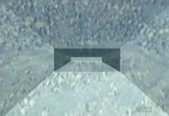 A beveled platform carrying a satellite view of the earth slides in from the left. The box tilts and locks in place straight along our line of sight. Facet lines are visible on the surface of the earth-picture, and a slit opens in center as the entire surface approaches us, inviting us down for barbecue, probably preceded by a shave and a skinning.